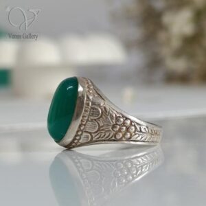 انگشتر نقره مردانه نگین سبز قلمکاری شده طرح گل کد 8115