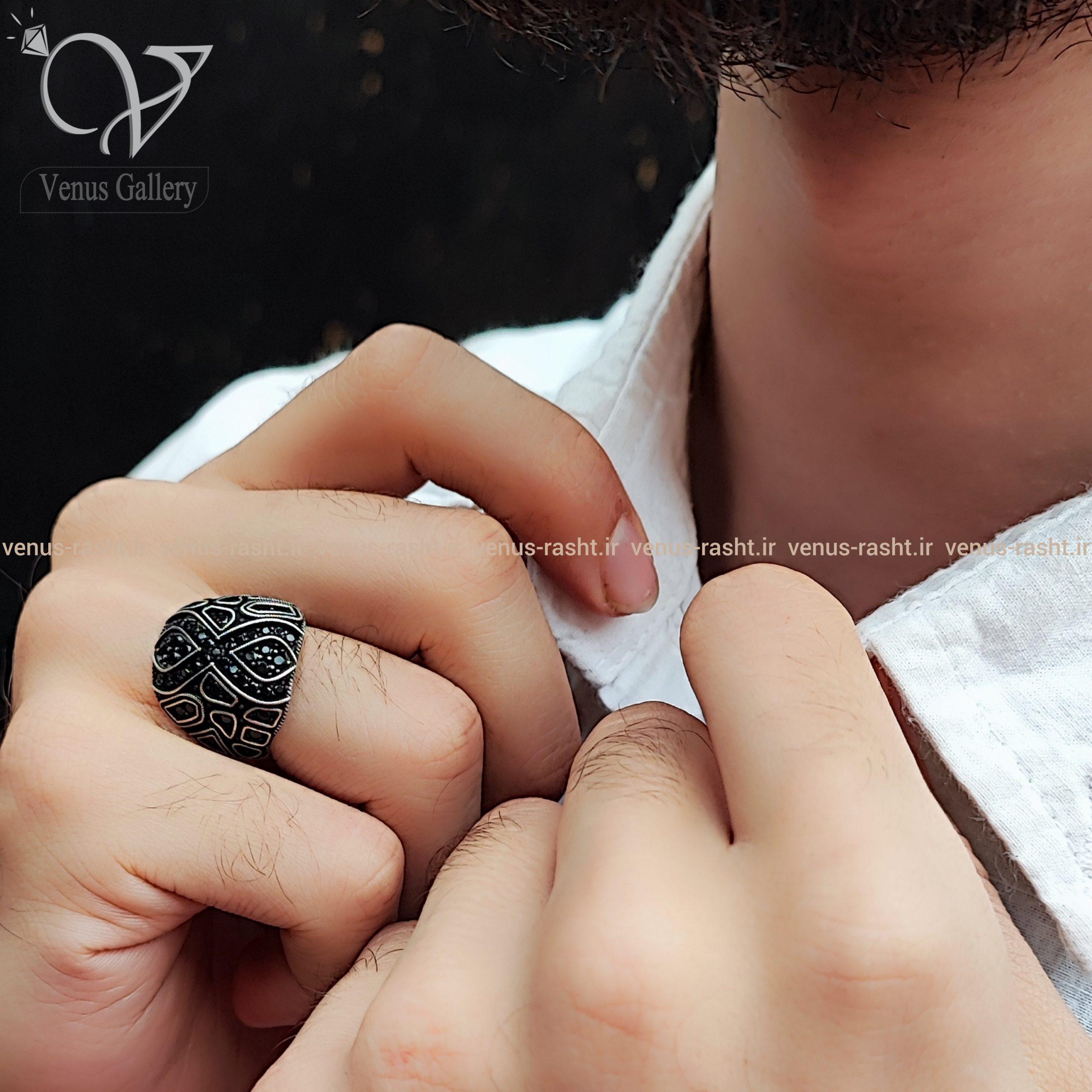 انگشتر نقره مردانه سیاه قلم ترک با نگینهای اتمی مشکی کد 4639