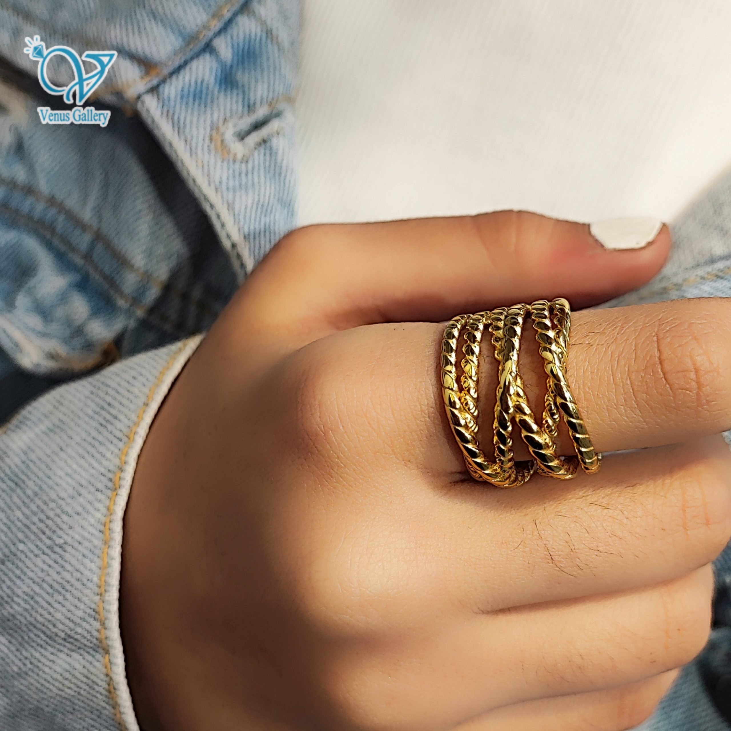 انگشتر زنانه چندلاین استیل طلایی مدل بافت