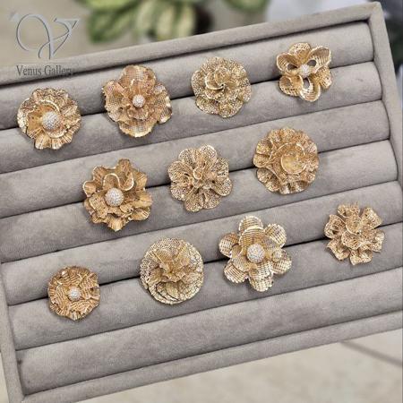 ساختهشده از نقره ۹۲۵ عیار با آبکاری طلا براق و طراحی خاص گل سهبعدی؛ تلفیقی از هنر مدرن و درخشش کلاسیک برای استایلهای لوکس و مجلسی.