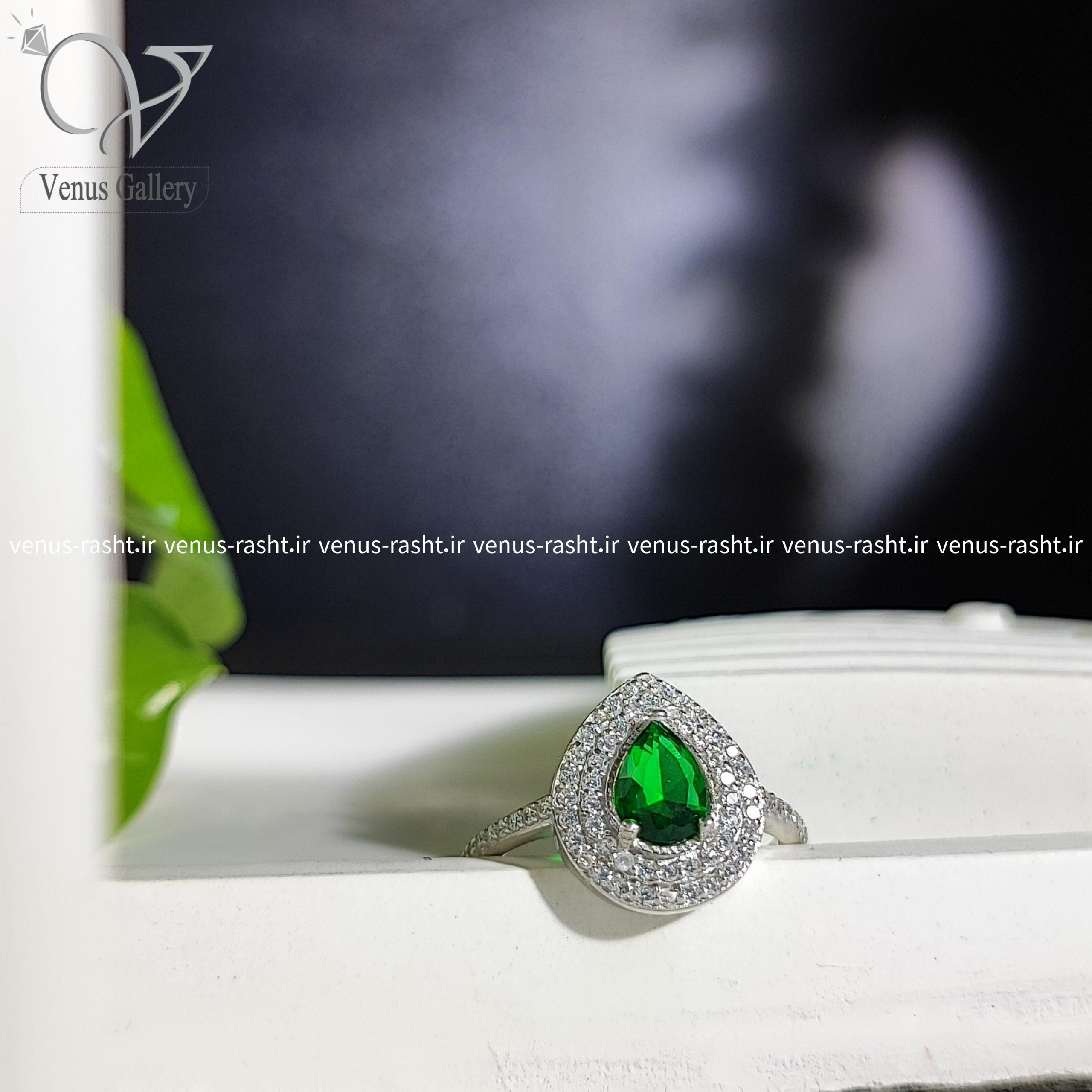 انگشتر نقره جواهری نگین سبز اشکی