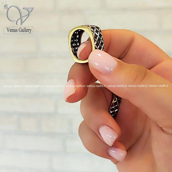 انگشتر نقره زنانه سیاه قلم مربعی طلایی