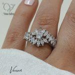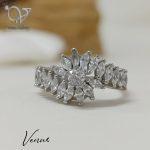 انگشتر نقره زنانه یکی از انگشترهای چشم نواز ساخته شده از نقره 925 عیار می باشد. سنگهای به کار رفته در این انگشتر فاخر از جنس اتمی زیرکونیا و مارکیز است. و کاملا به صورت میکروستینگ مخراجکاری شده اند ، از این رو کاملا در برابر ضربه مقاوم اند .