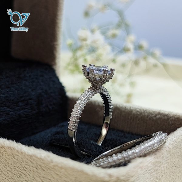برای ساخت این حلقه پشت حلقه زیبا از نقره استرلینگ عیار 925 استفاده شده است. که در روی آن روکش رودیوم قرار گرفته شده است. که رنگ فلز را همانند طلاسفید میکند. به طوری که غیر قابل تشخیص از نمونه طلاسفید باشد.