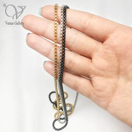 - مدل ویتالی (Box Chain): طراحی خاص و پرطرفدار “باکس”، که بافت محکم و سطحی درخشان و یکدست به زنجیر میدهد. یک کلاسیک مدرن که هیچوقت از مد نمیافتد.