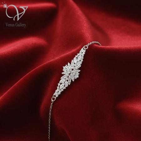 - طراحی ظریف برگ با نگینهای درخشان، جلوهای لوکس و مشابه طلا سفید ایجاد میکند