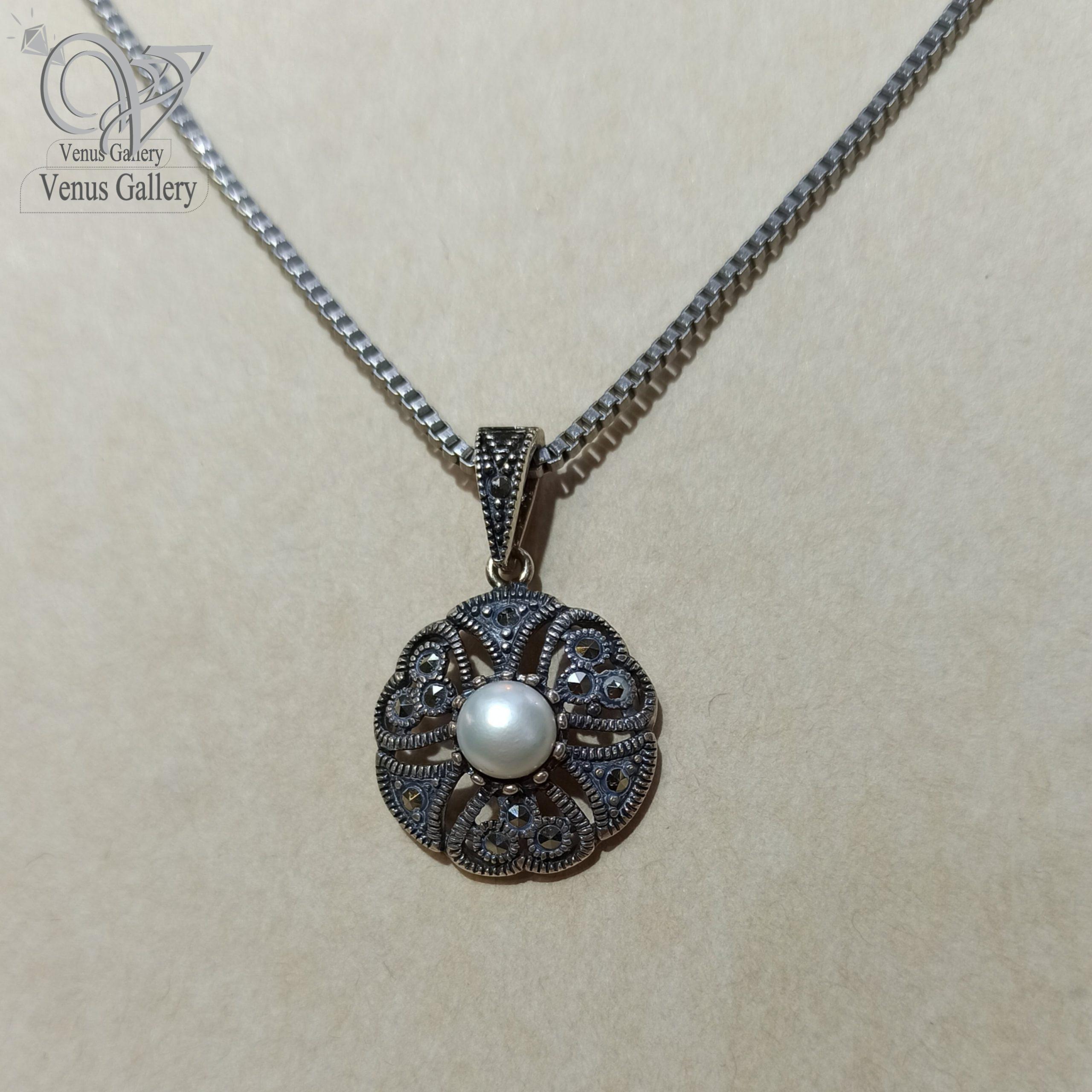 مدال نقره طرح گل و مروارید سیاه قلم با نگین مارکازیت