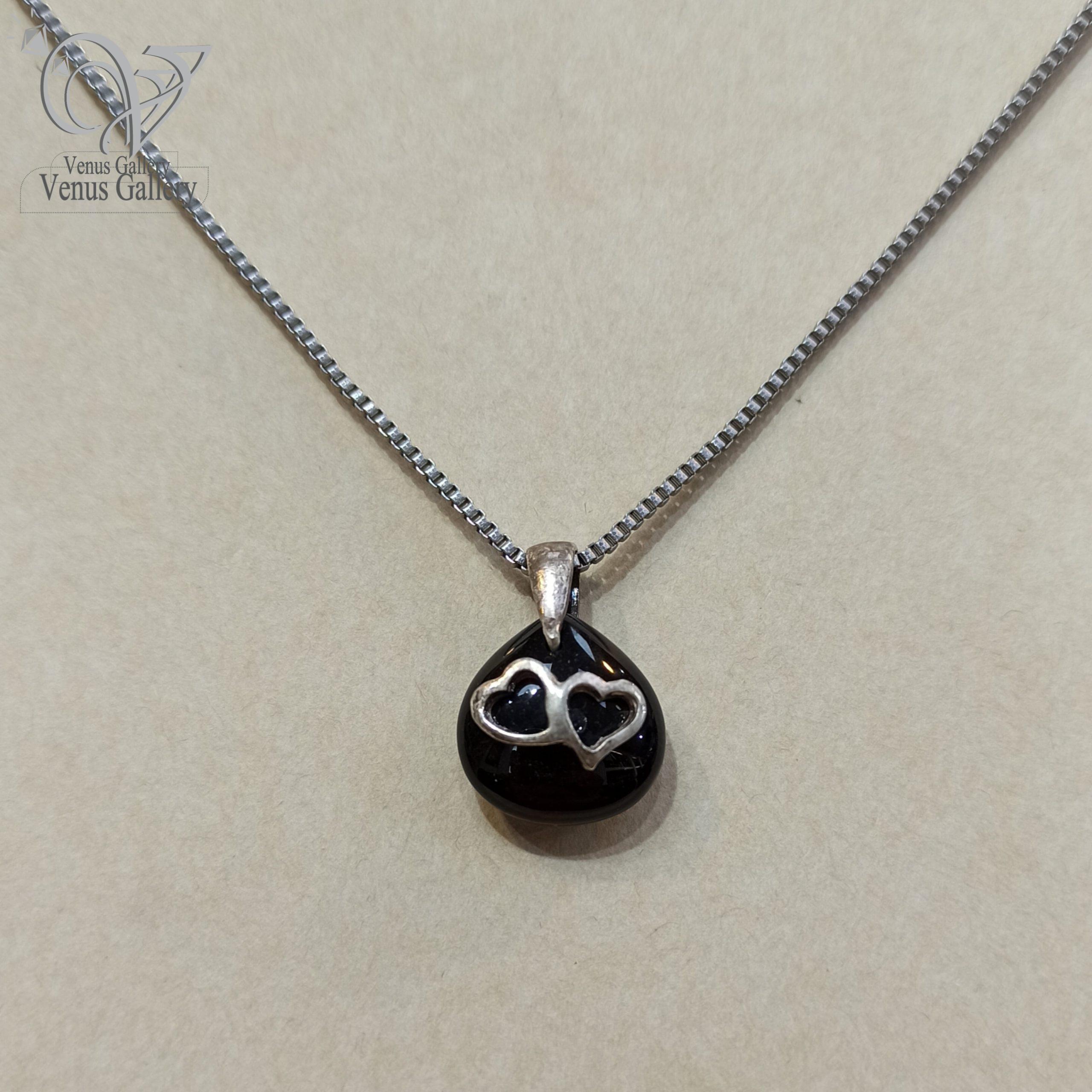 مدال نقره ظریف دخترانه طرح دو قلب با سنگ اونیکس مشکی کد 4180