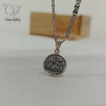در قلب این دایره، کلمه مبارکه “الله” با برجستگی چشمنواز و هنرمندانه جای گرفته است. این برجستگی نه تنها جلوهای سهبعدی و فاخر به پلاک نقره الله میبخشد، بلکه گویی نام پروردگار را در هالهای از نور و شکوه، متجلی میسازد. نقره خالص در کنار این طرح برجسته، ترکیبی از اصالت و مدرنیته را به ارمغان میآورد.