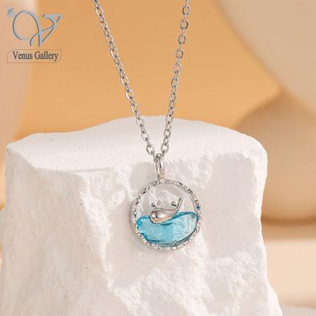 - طراحی بینظیر: آویز دایرهای شکل با جزئیات دقیق از دلفین نقرهای بر روی موج آبی، یک اثر هنری خیرهکننده است.