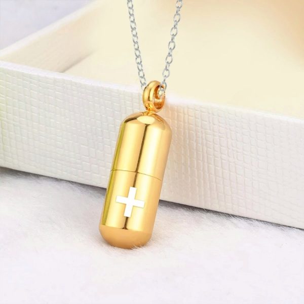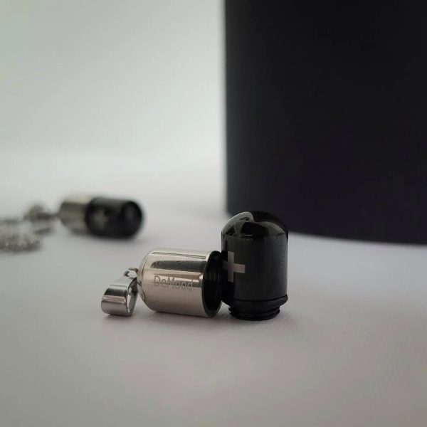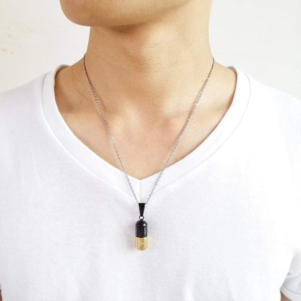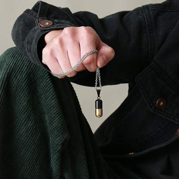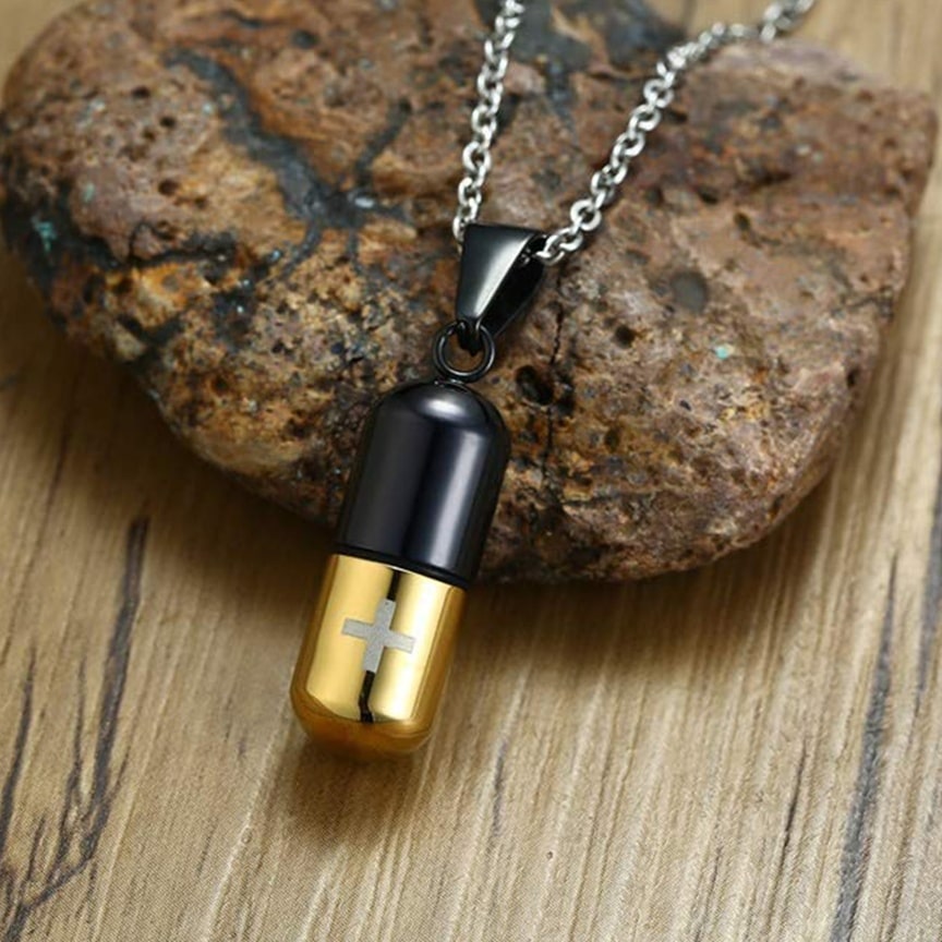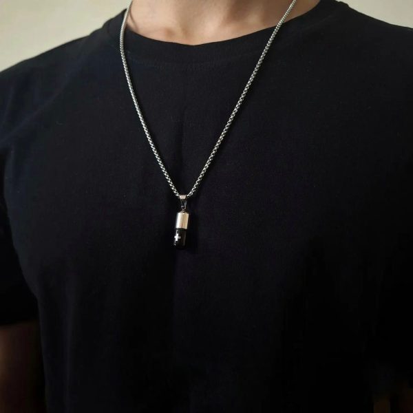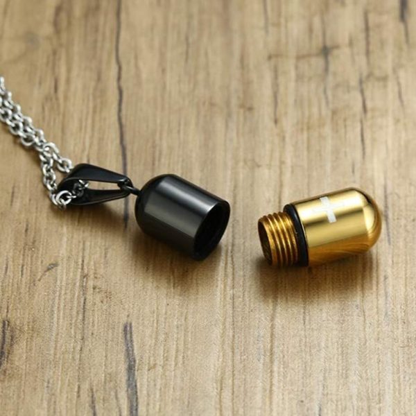 گردنبند کپسولی ساخته شده از استیل با قابلیت باز شدن دو نیمه ی کپسول و امکان جا دادن نوشته و … در داخل آن است.