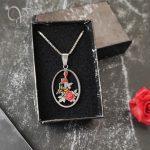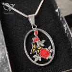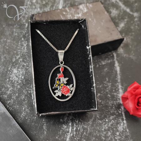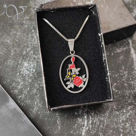 گردنبند دخترانه گل رز قرمز و پروانه نمایانگر عشق خالص و پایدار است.